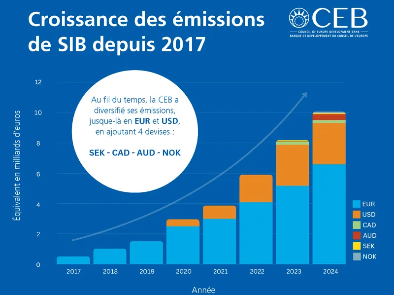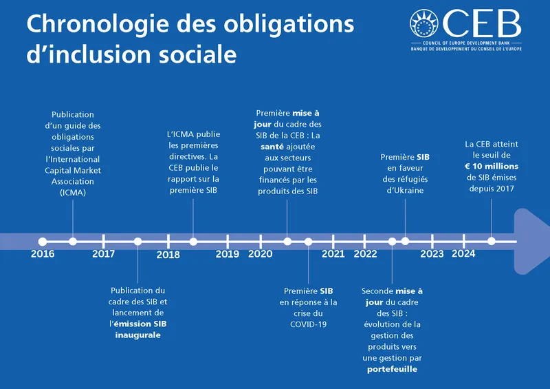 En 2017, lorsque la première SIB a été émise, il s’agissait d’une transaction révolutionnaire car le marché des obligations sociales en était à ses balbutiements. La CEB, l’un des fondateurs du groupe de travail sur les obligations sociales de l’Association internationale des marchés de capitaux (ICMA), a travaillé en étroite collaboration avec ICMA pour développer un marché des obligations sociales, ainsi que pour définir des directives appropriées à ce nouvel instrument.